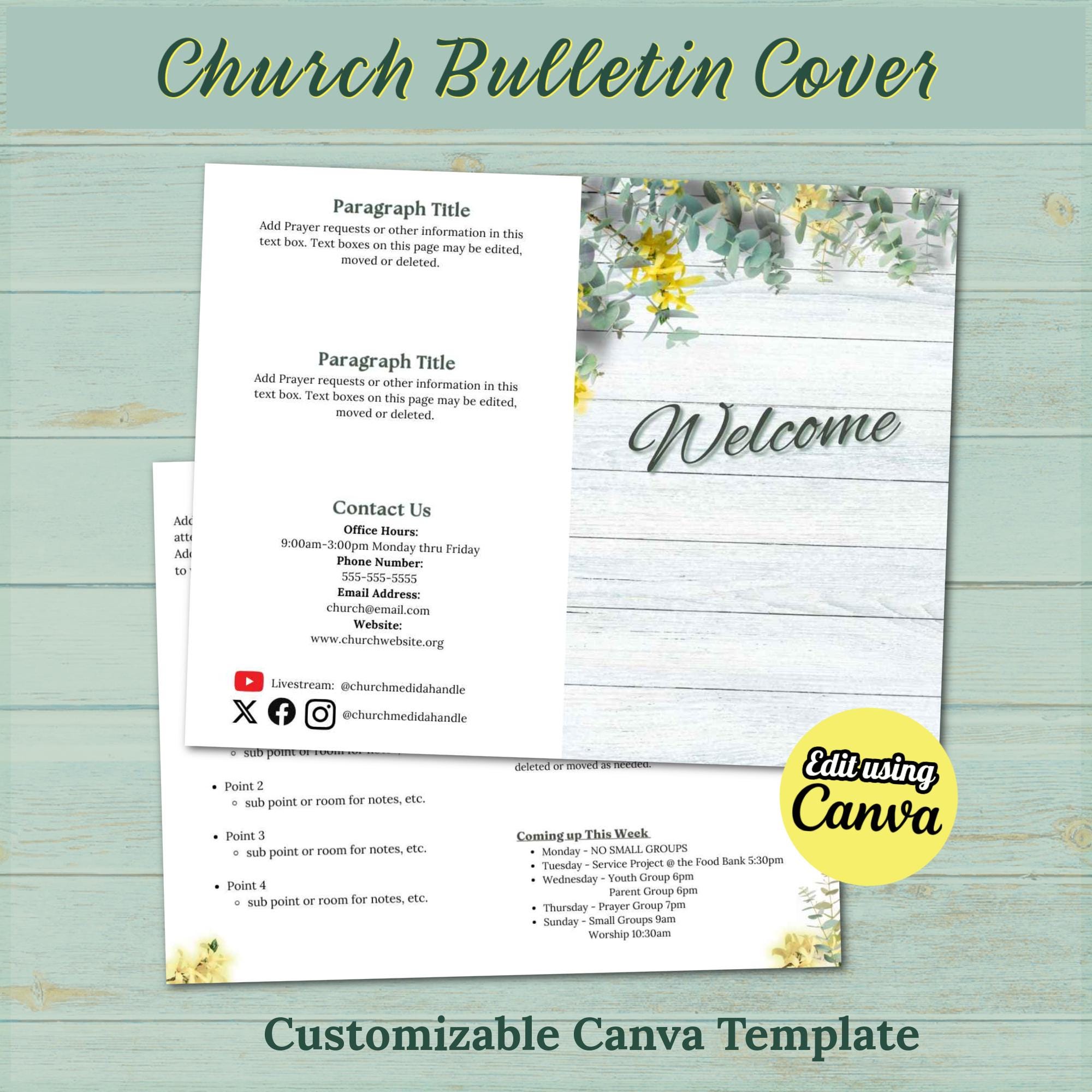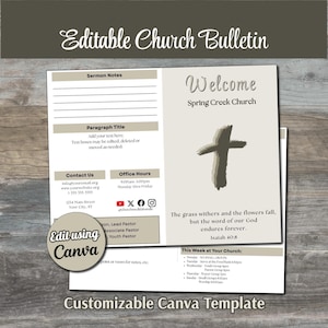 Instantly download, edit, and print this time-saving Canva Template. Designed as an 11" x 8.5" bi-fold Church Worship Folder, the template is easily customizable including fonts, text and background. With your Free or Pro Canva account, you can quickly edit the components to compliment your brand and/or design aesthetic, or use the template as-is and simply personalize the text. Elements such as text, colors, images, and fonts can be customized in minutes, resulting in a customized and personalized document for your church or event.