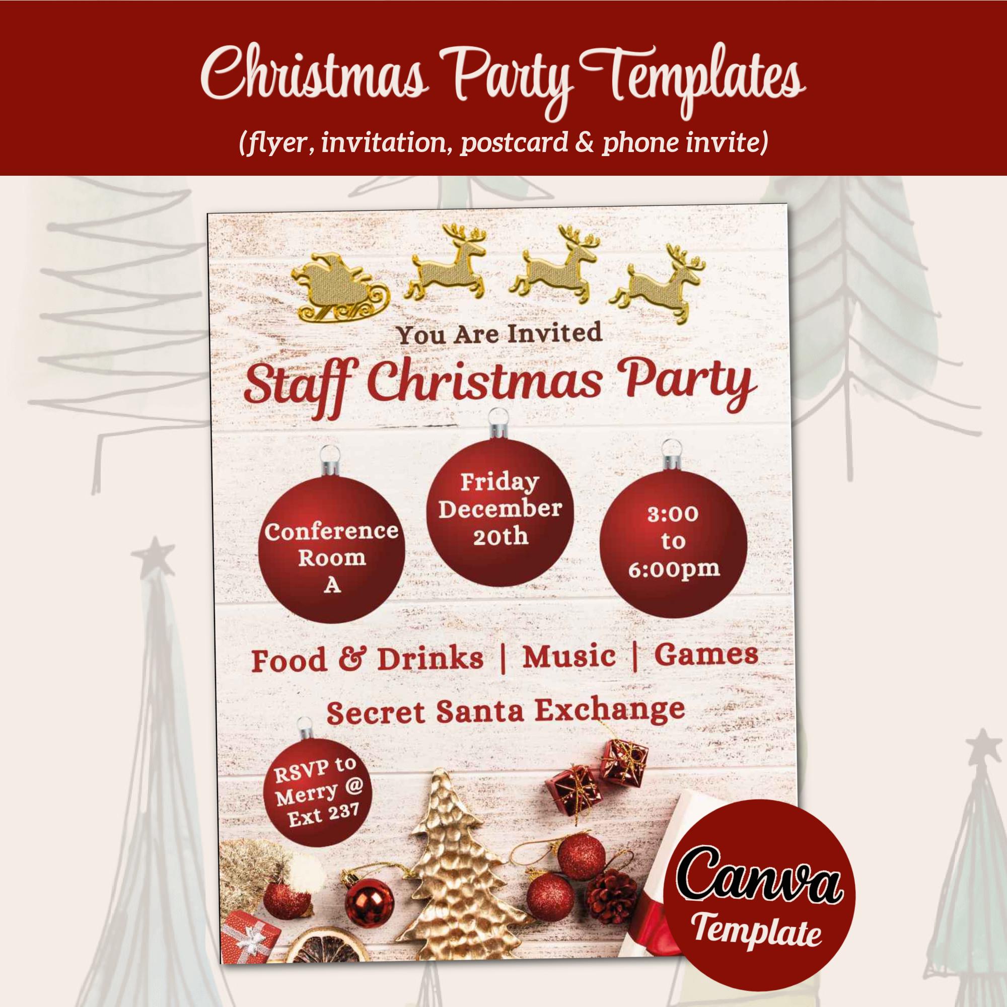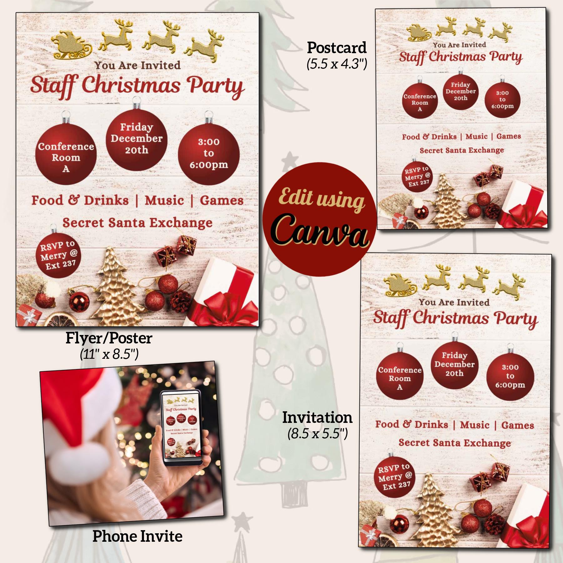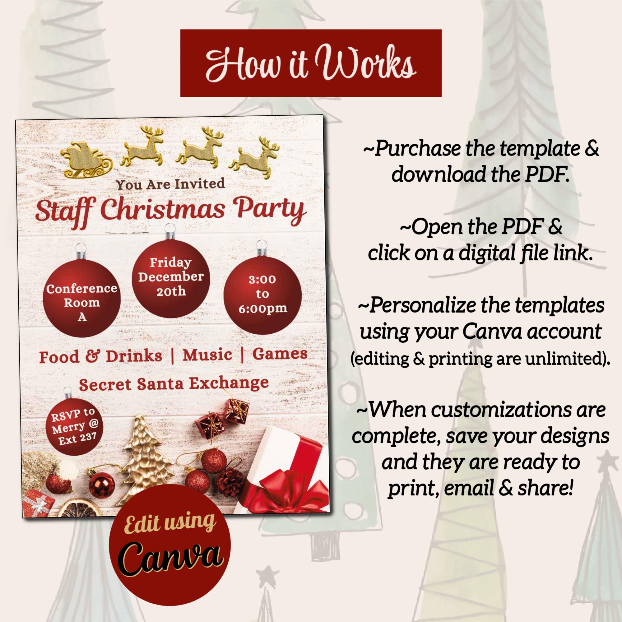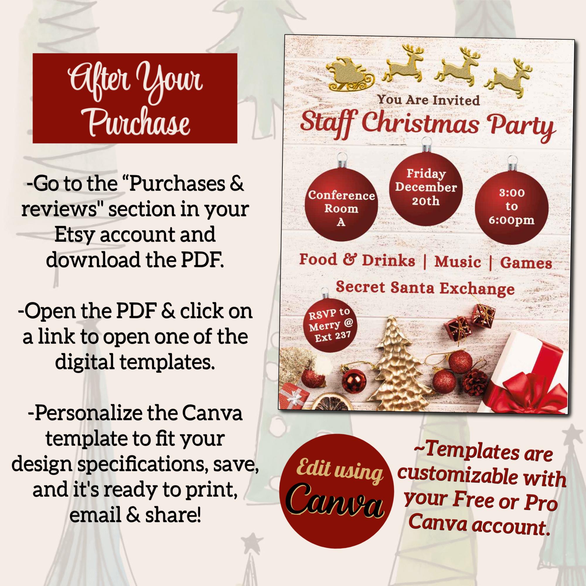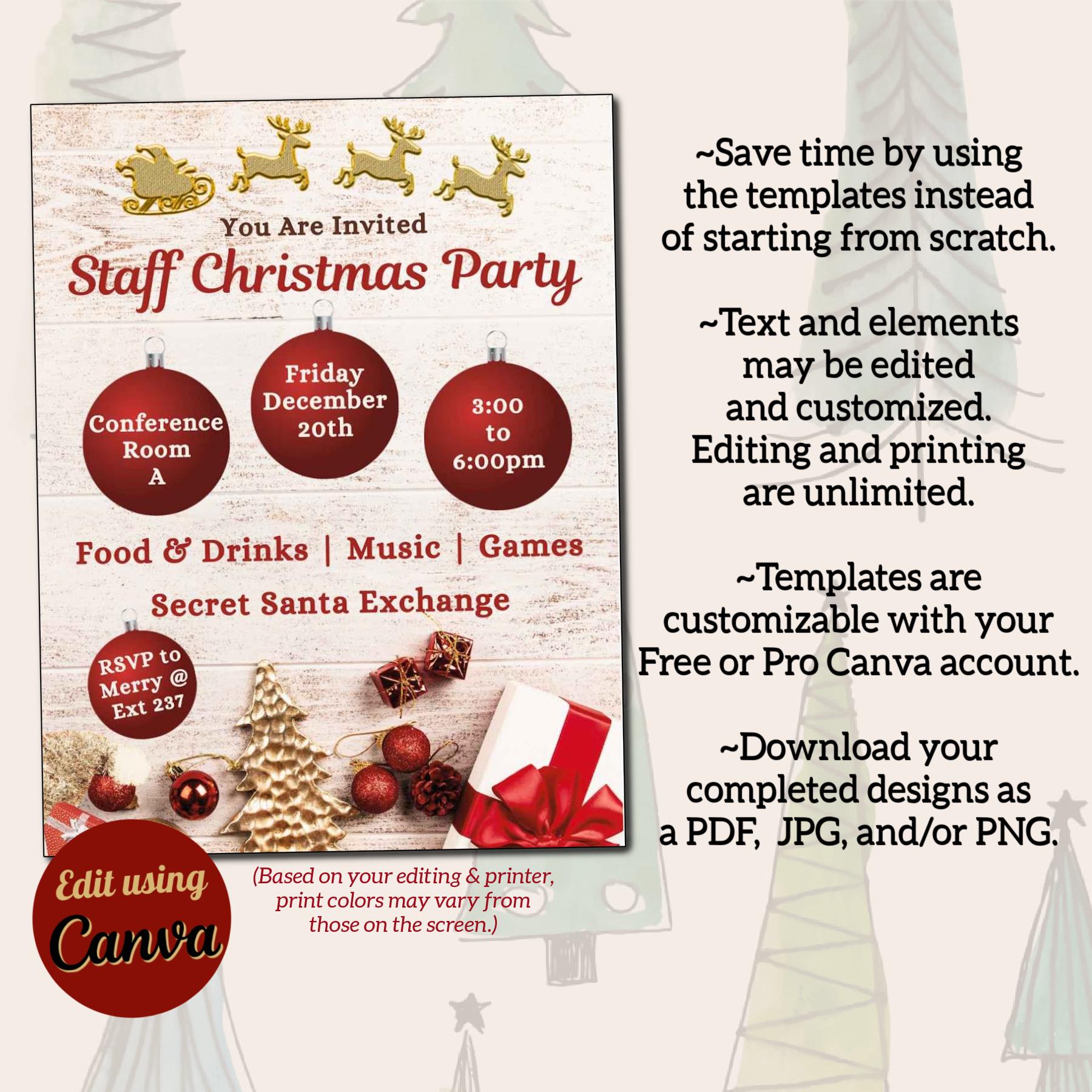 This Christmas Flyer template provides you with the perfect starting point from which to design a Christmas Party or Event flyer for your Business, Church, or School. Designed in Canva, the flyer and invitation templates are fully customizable including font styles, text, images, and background. With your Free or Pro Canva account, it is easy to edit some or all of the components of the templates. Elements such as text, images, and font styles can be changed to create the perfect holiday celebration flyer. Customize the flyer and invitation in minutes to complement your overall design aesthetic. Download it for print (PDF), or to send digitally via email or social media (JPG).