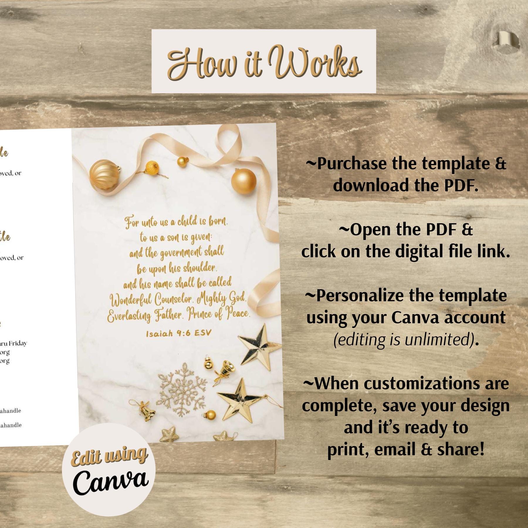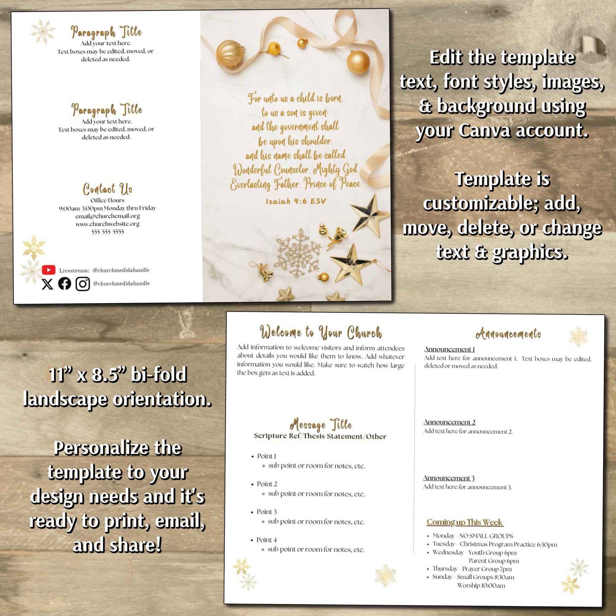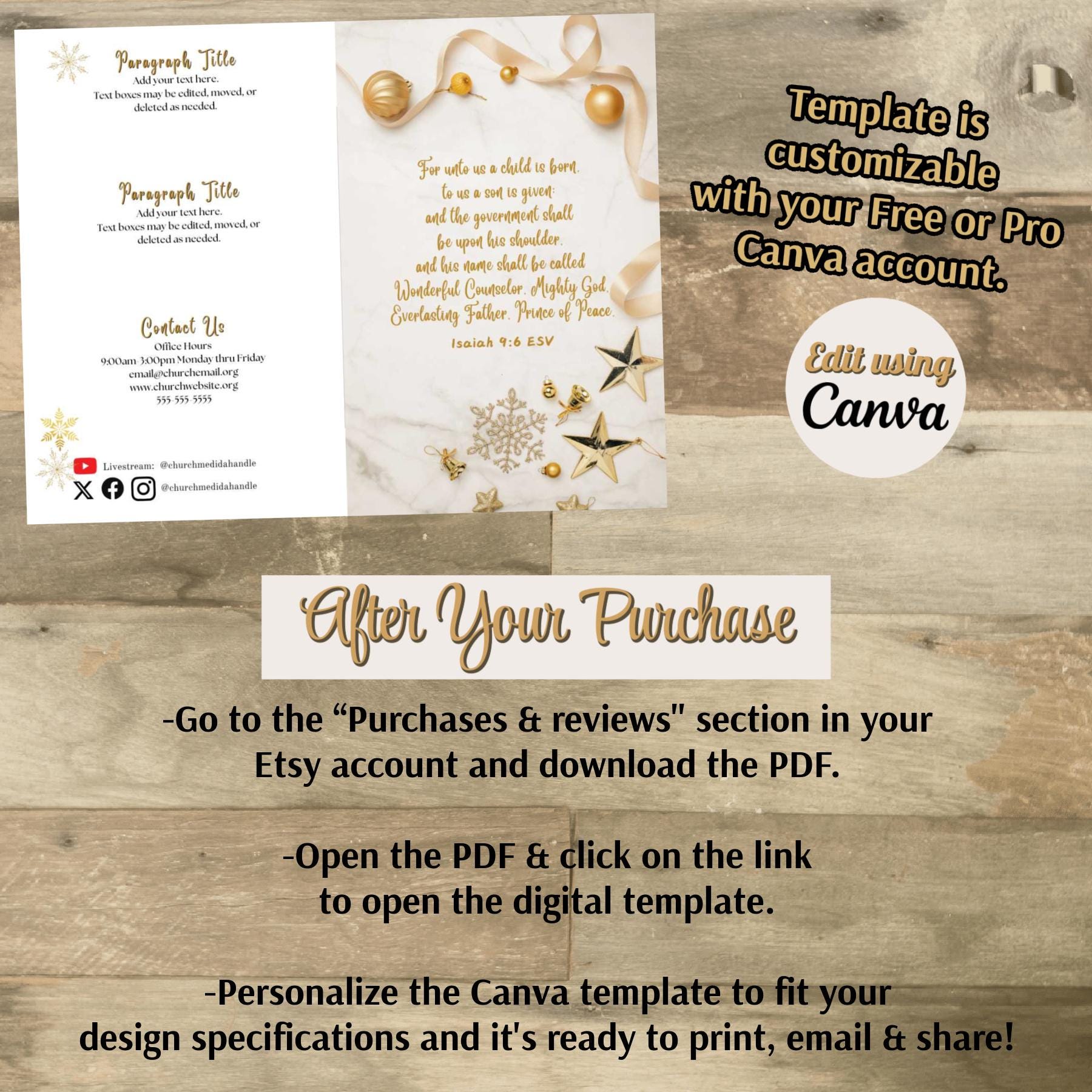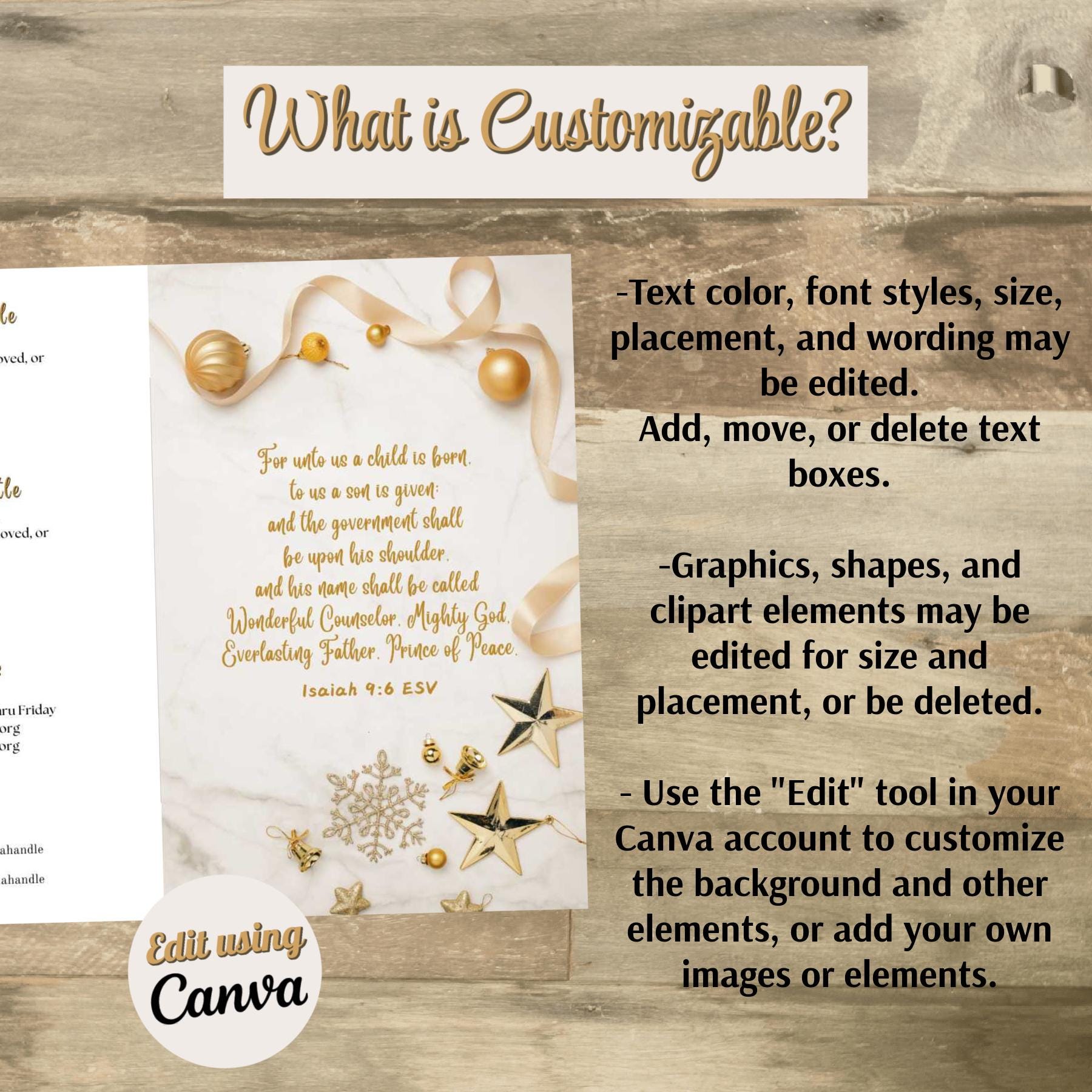 Instantly download this customizable Gold Star Christmas Bulletin template to use as a Church Worship Folder or Christmas Program. The 11" x 8.5" bi-fold, landscape design is editable including the font styles, text and background. With your Free or Pro Canva account, the template is ready for you to edit some or all of the components. Use the template as-is, or personalize it to compliment your brand and design aesthetic. Elements such as text, colors, images, and font styles can be customized in minutes, or you can use the template as-is and simply edit the text. Either option results in a personalized document for your church or event.