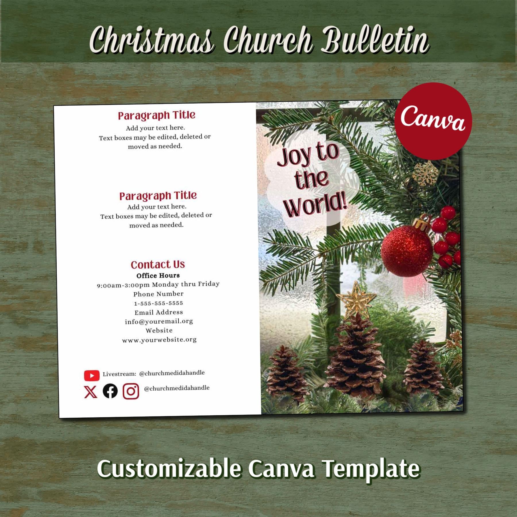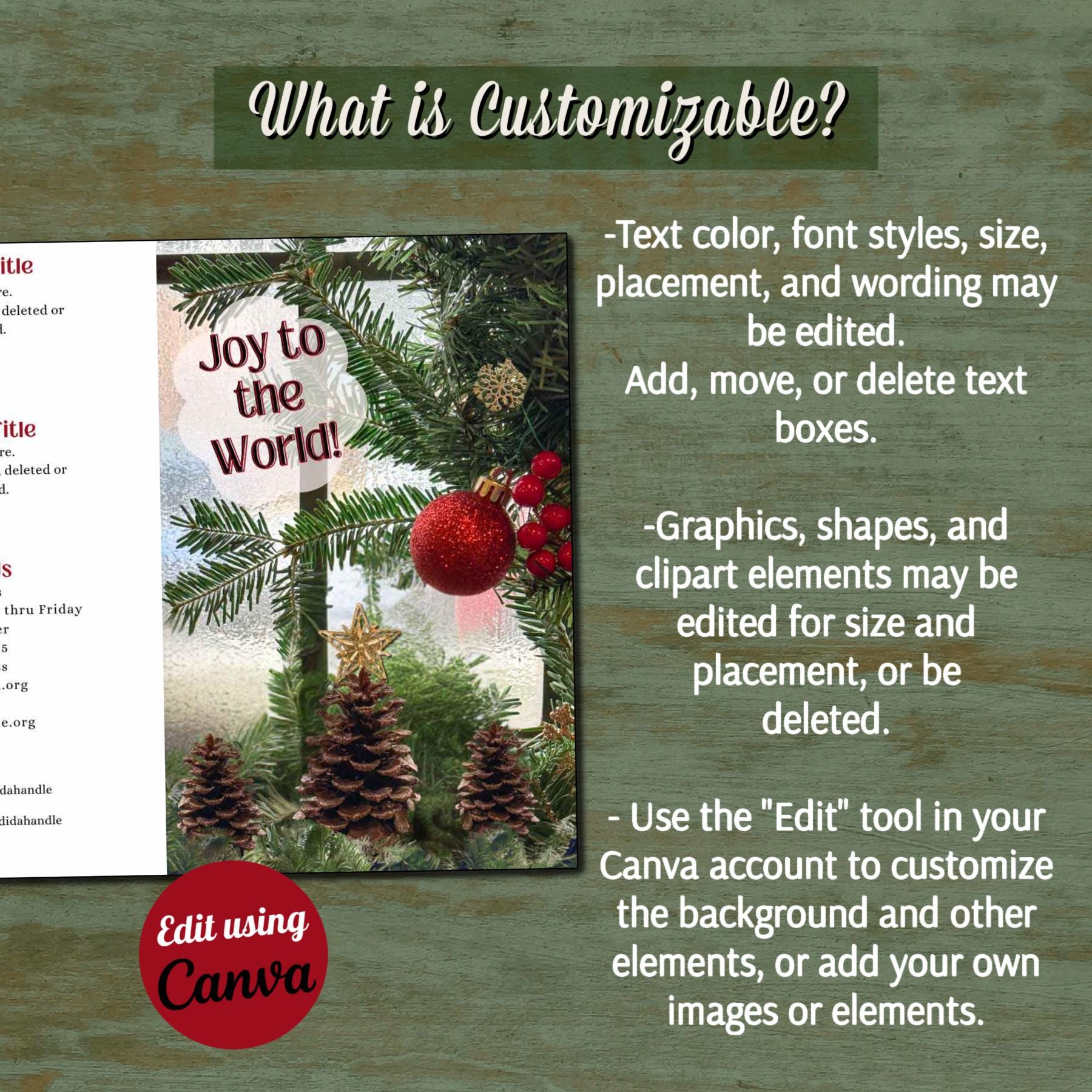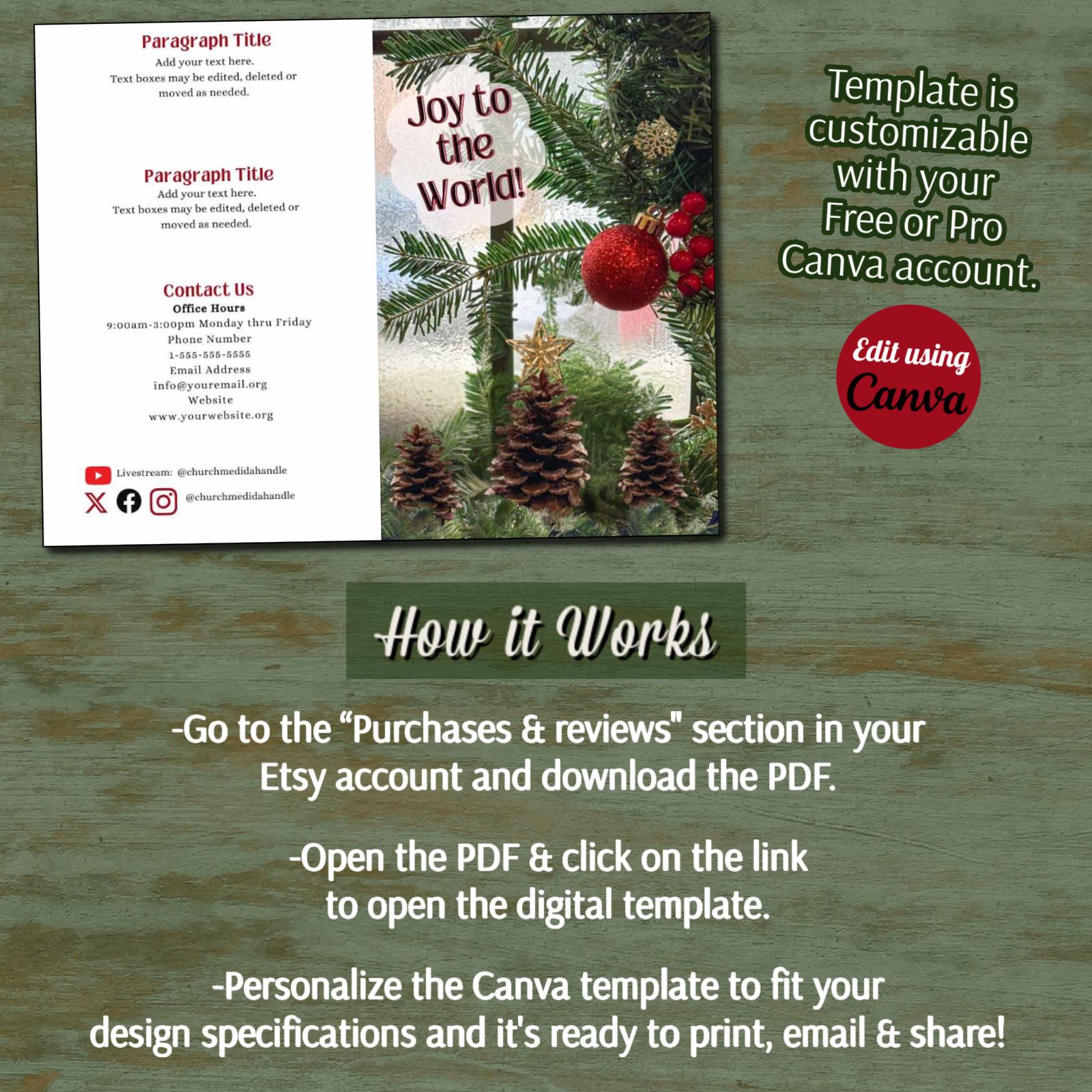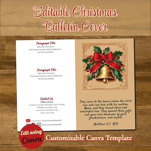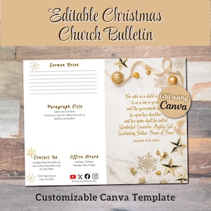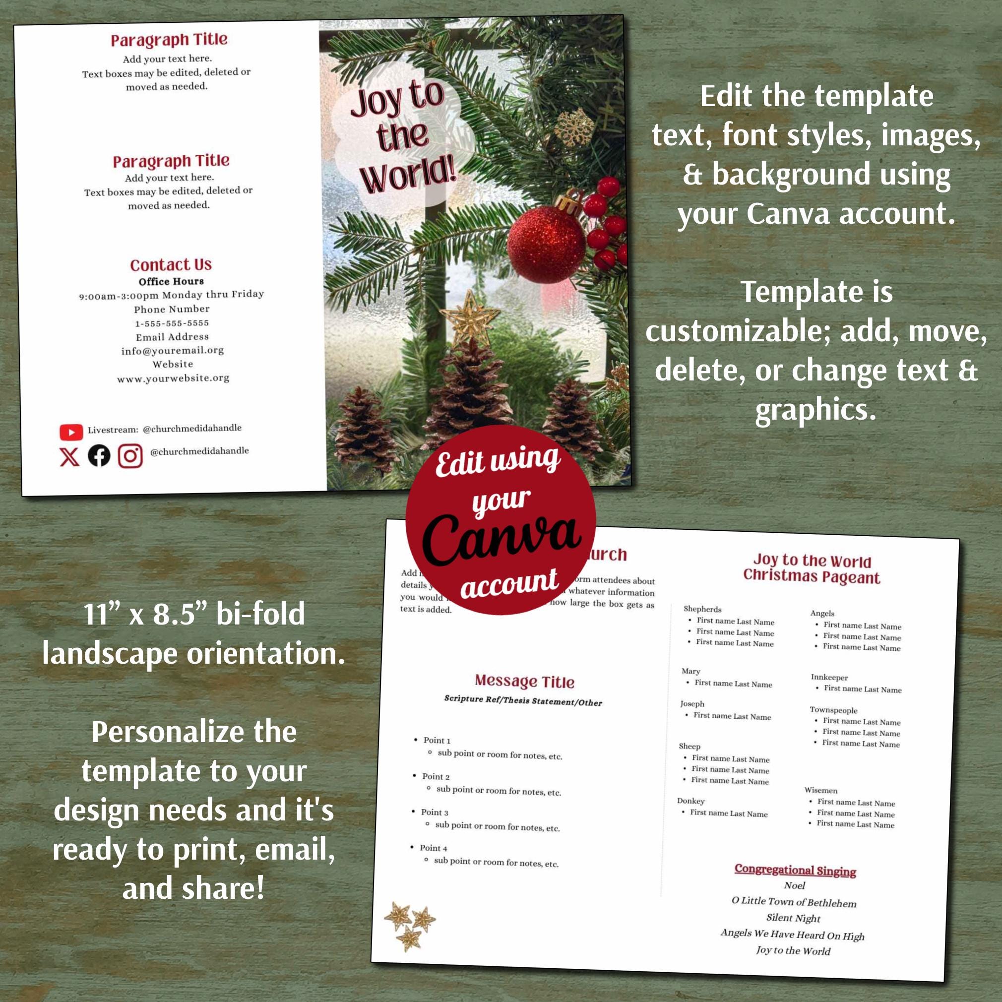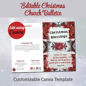 This time-saving Canva Template is designed as an 11" x 8.5" bi-fold church bulletin. The Christmas Bulletin template is easily customizable including font styles, text and background. With your Free or Pro Canva account, you can quickly edit the components to complement your brand and/or design aesthetic, or simply add your text to the template and it's ready to print. Elements such as text, colors, images, and font styles can be customized in minutes, resulting in a personalized document for your church or event.