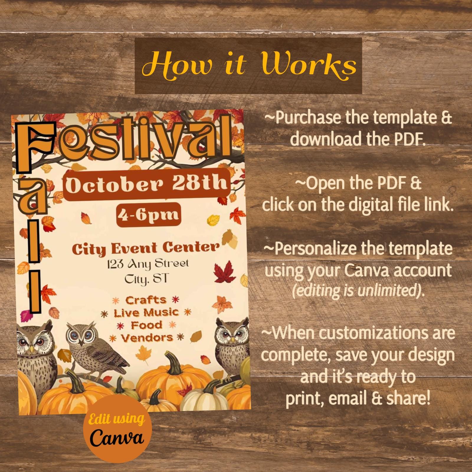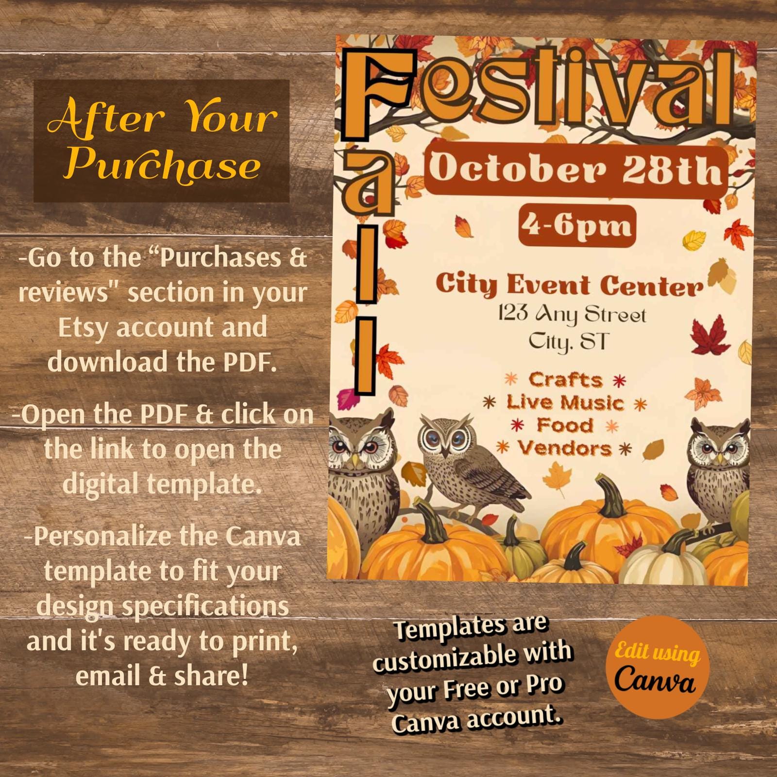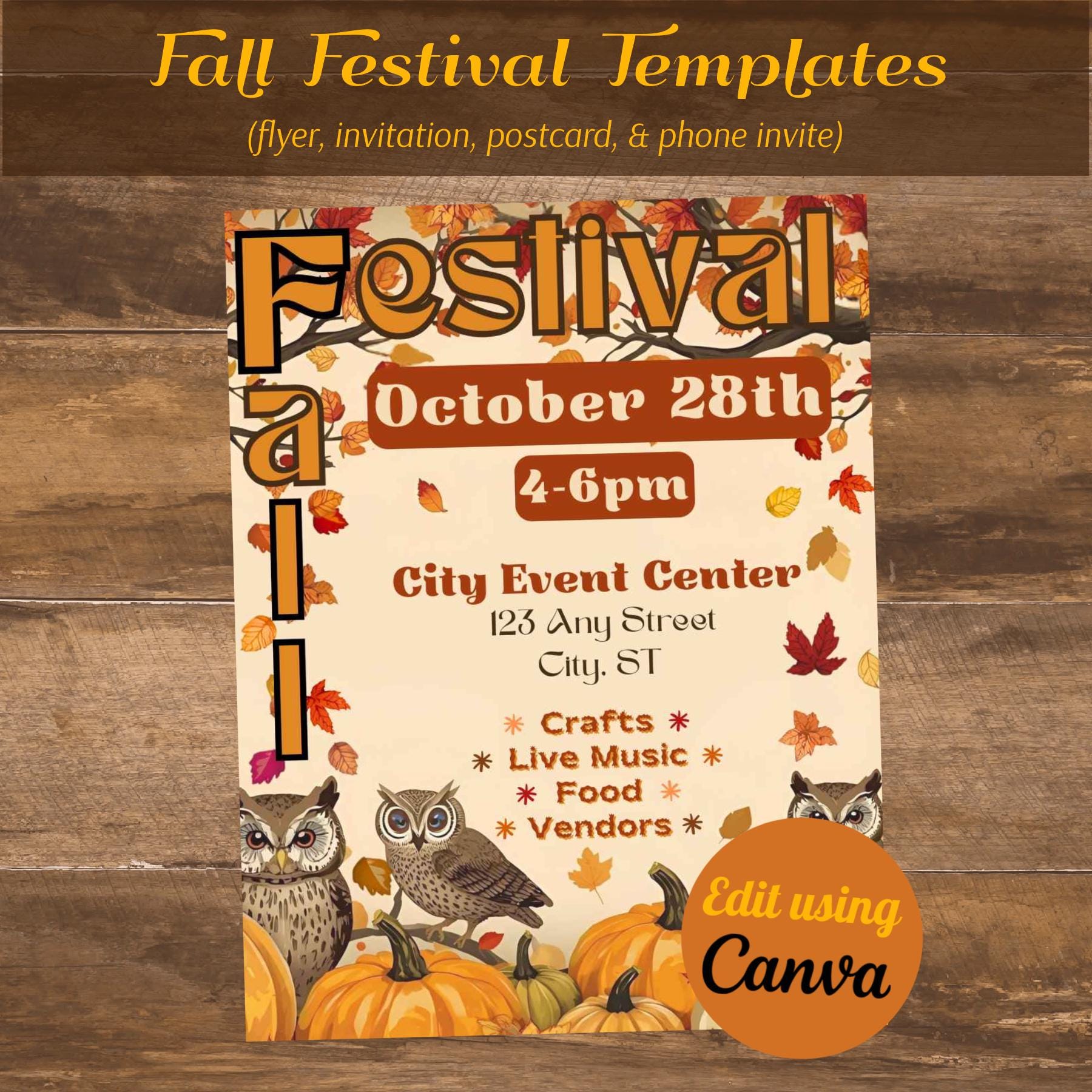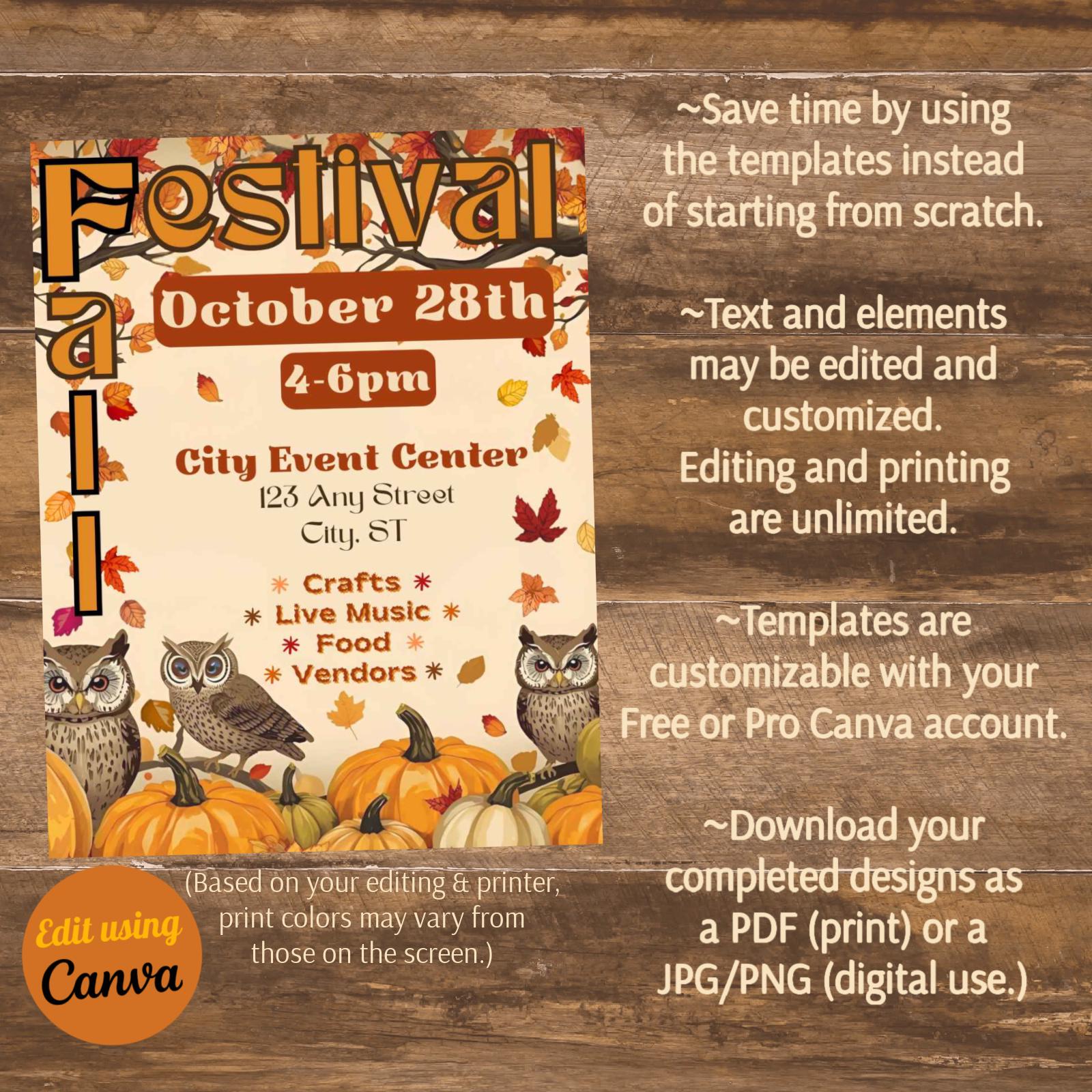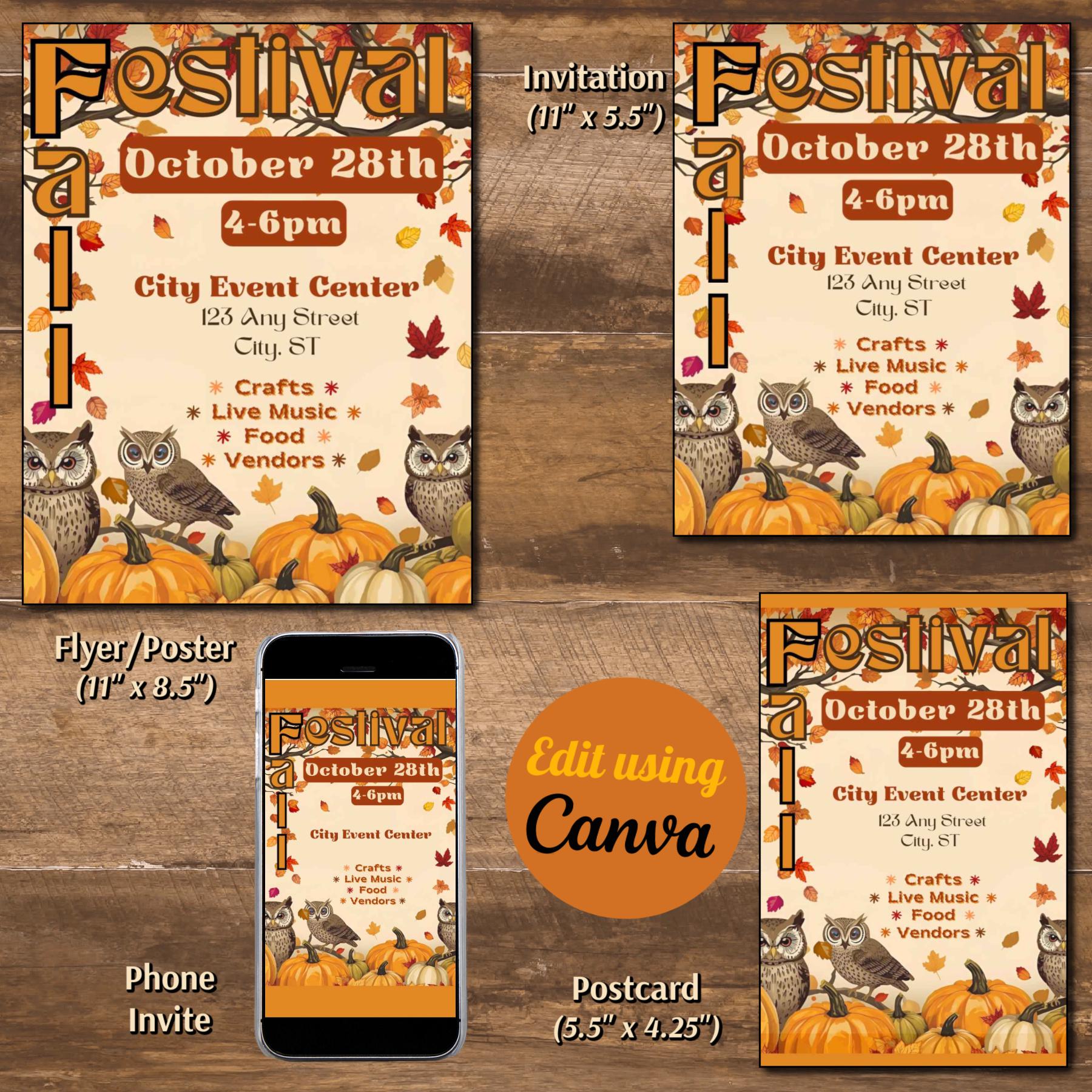 Instantly download and edit these Fall or Harvest Festival templates. These provide you with the perfect starting point from which to design a flyer, invitation, postcard, and phone templates for your event. Each template is customizable including font styles, text, images, and background. With your Free or Pro Canva account (free online editing software,) it is easy to edit some or all of the template components. Elements such as text, colors, images, and font styles can be customized in minutes to create the perfect design. Download it for print (PDF), or to share digitally via email or social media (JPG).