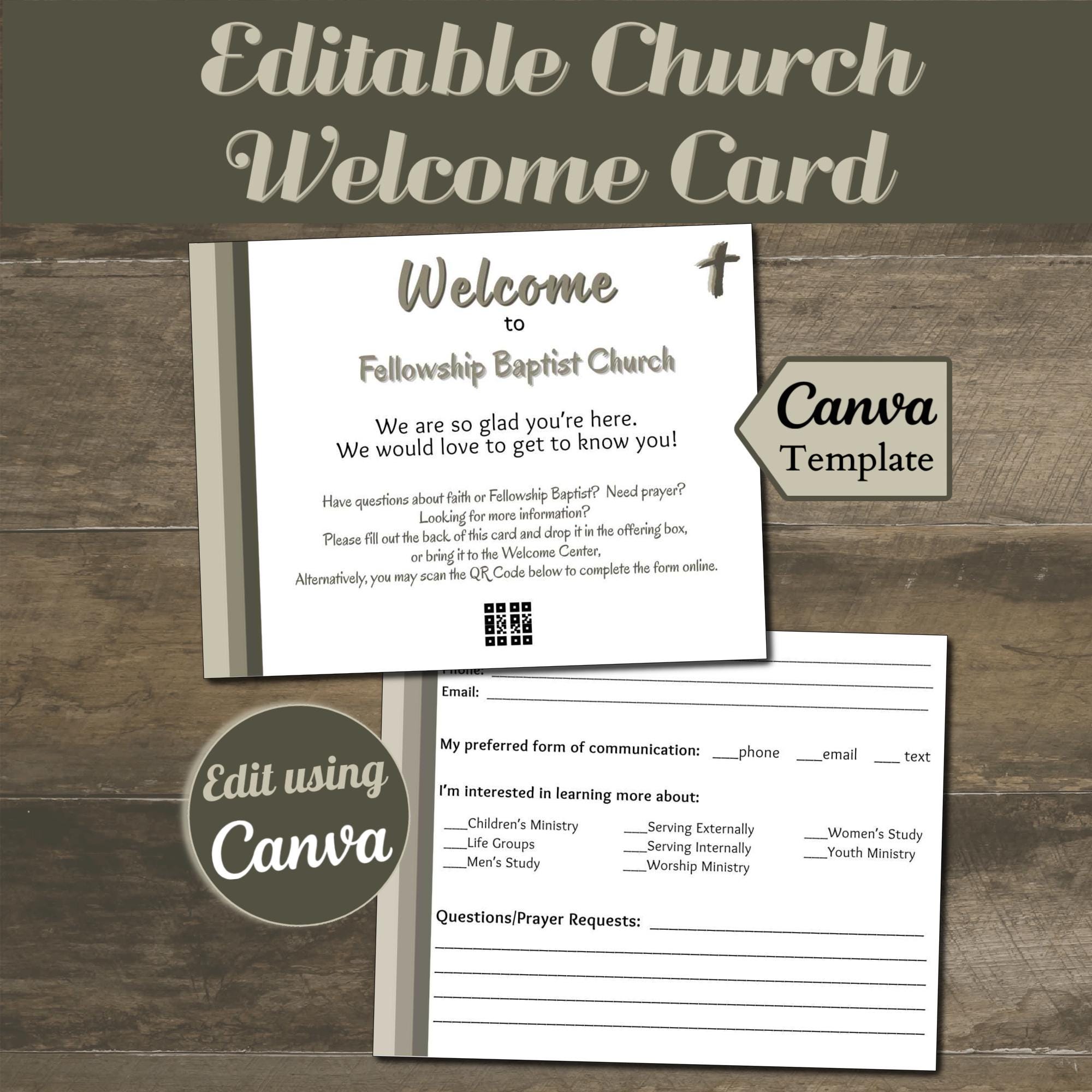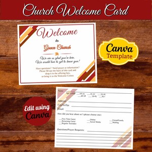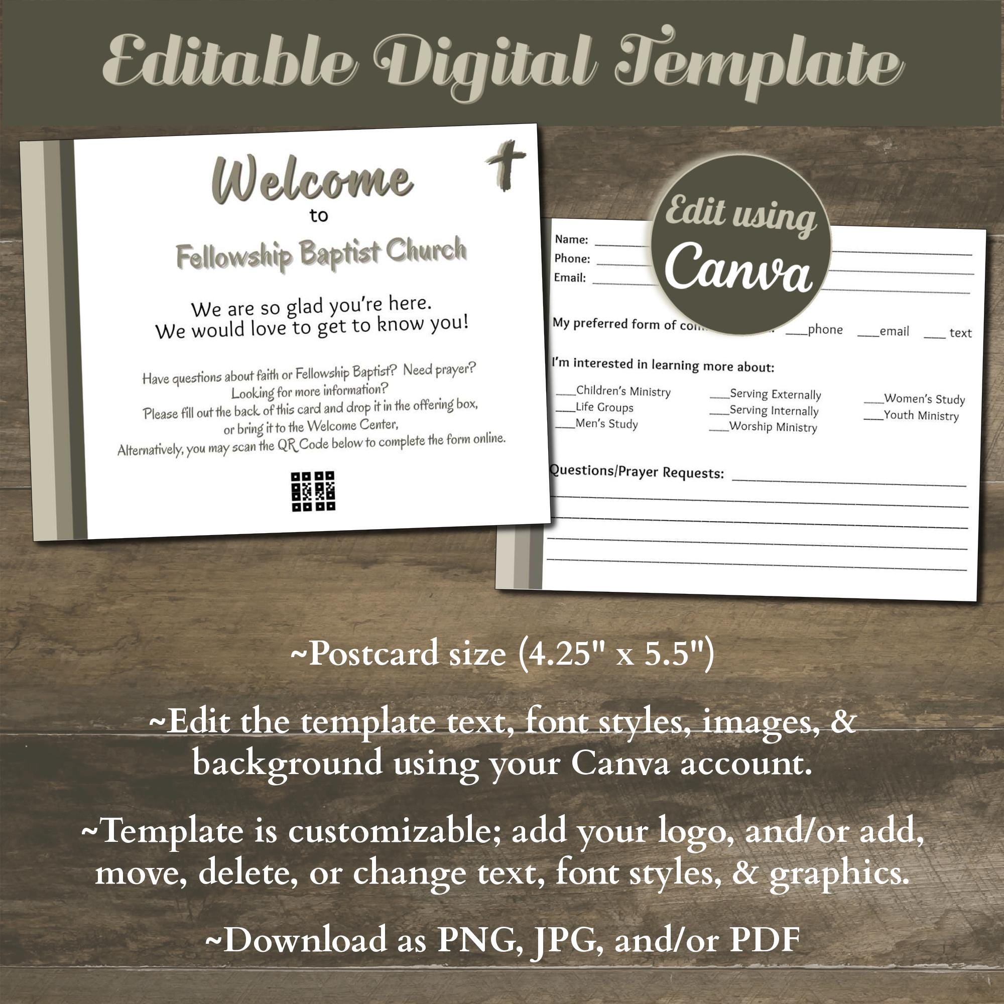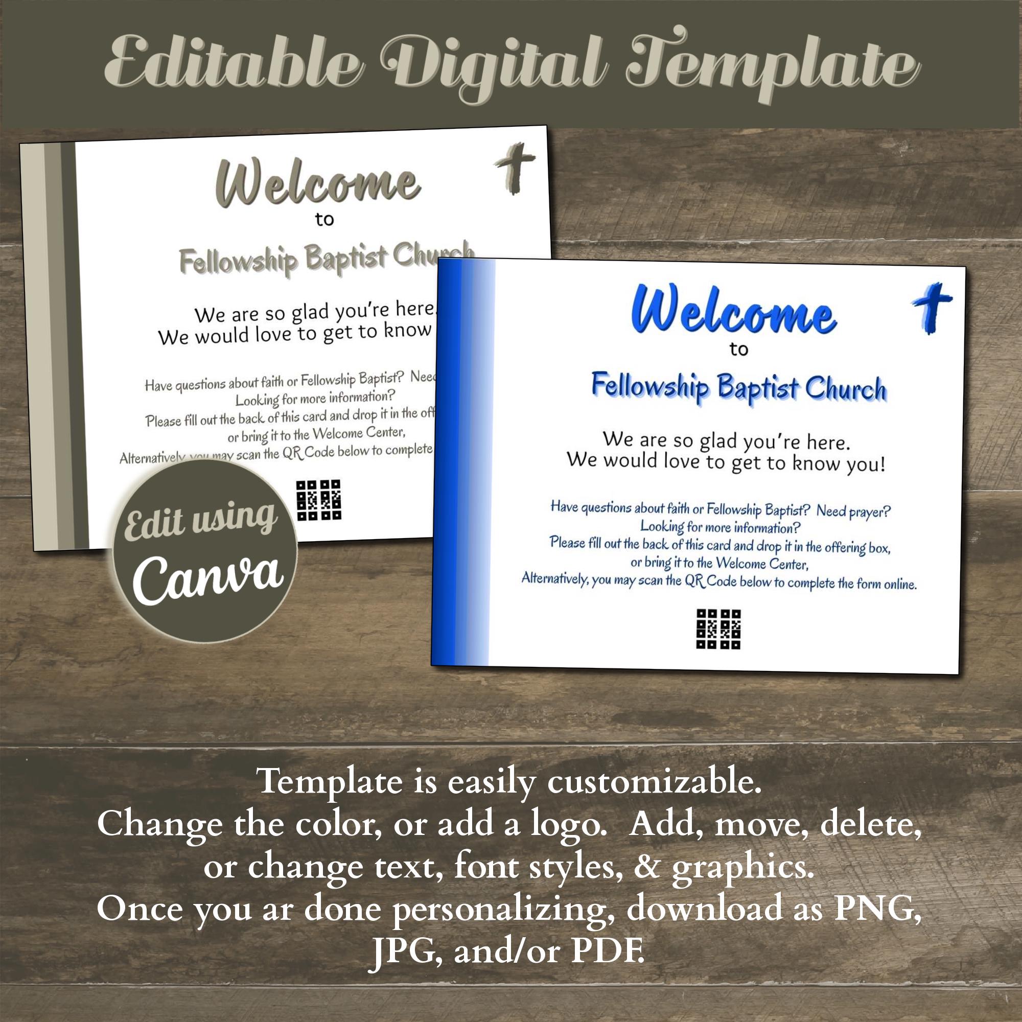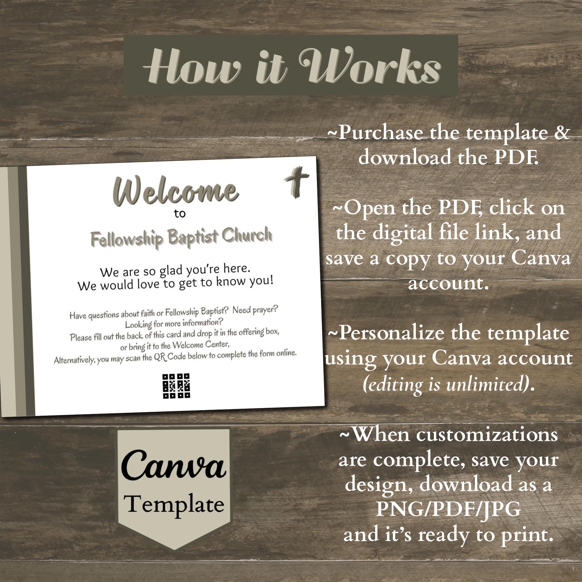 Looking for a way to connect and enhance communication with attendees and/or visitors? Instantly download and edit this time-saving Canva design. The template is a 4.25 x 5.5” easily customizable postcard-sized design. With your Free or Pro Canva account, you can quickly edit the components to complement your current print and digital media, or use the template as-is and simply personalize the text. Elements such as text, colors, images, and font styles can be customized in minutes, resulting in a personalized document for your church or organization.
